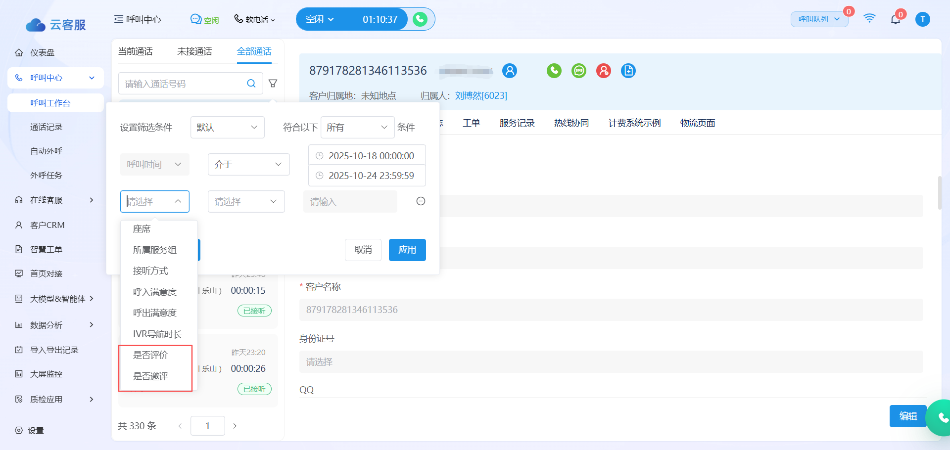 【优化】通话记录列表和全部通话列表中高级筛选新增“是否评价”与“是否邀评”字段,并支持按“是/否”进行条件筛选