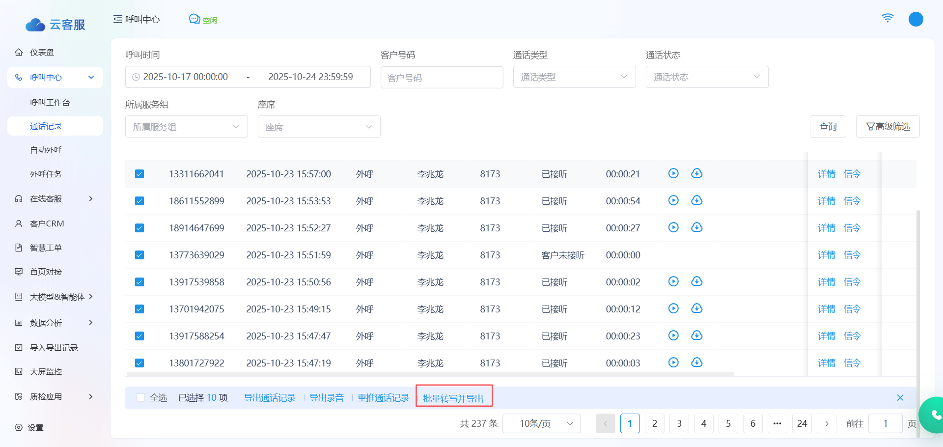 【优化】通话记录列表支持批量对通话录音进行离线转写,并异步导出包含通话ID、起止时间及转写文本的内容(仅计费跳转可见按钮)