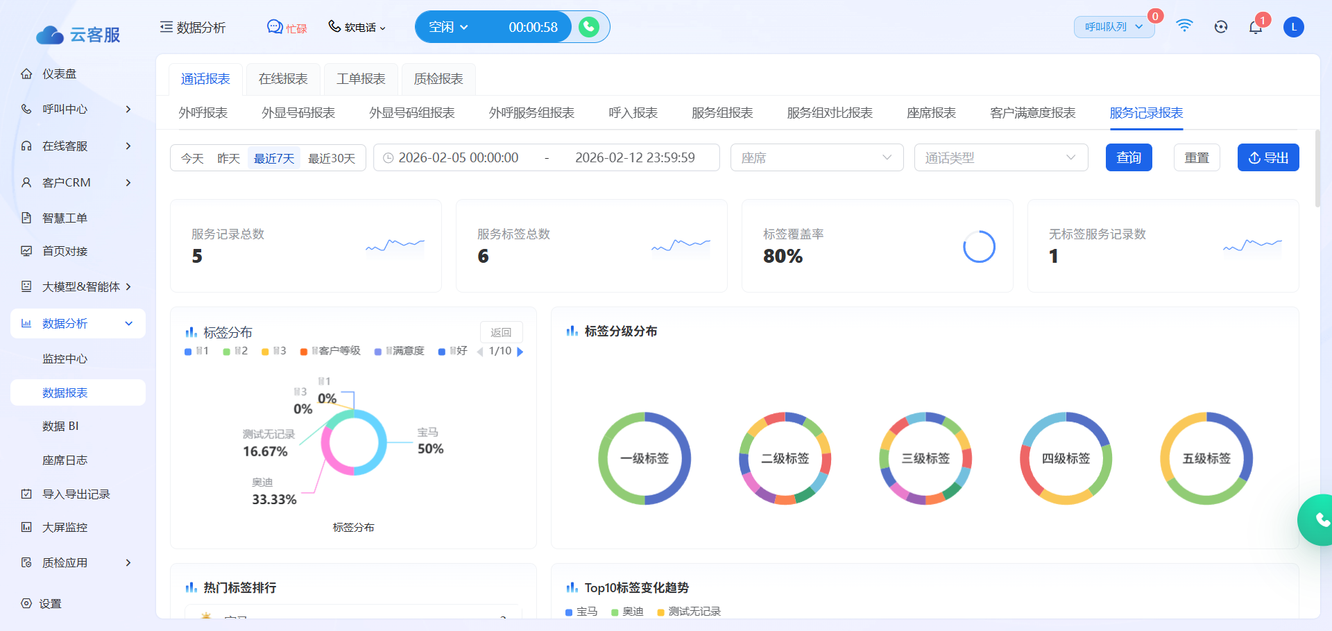 【优化】数据分析-数据报表内,通话报表和在线报表新增服务记录报表,可查看服务标签分布