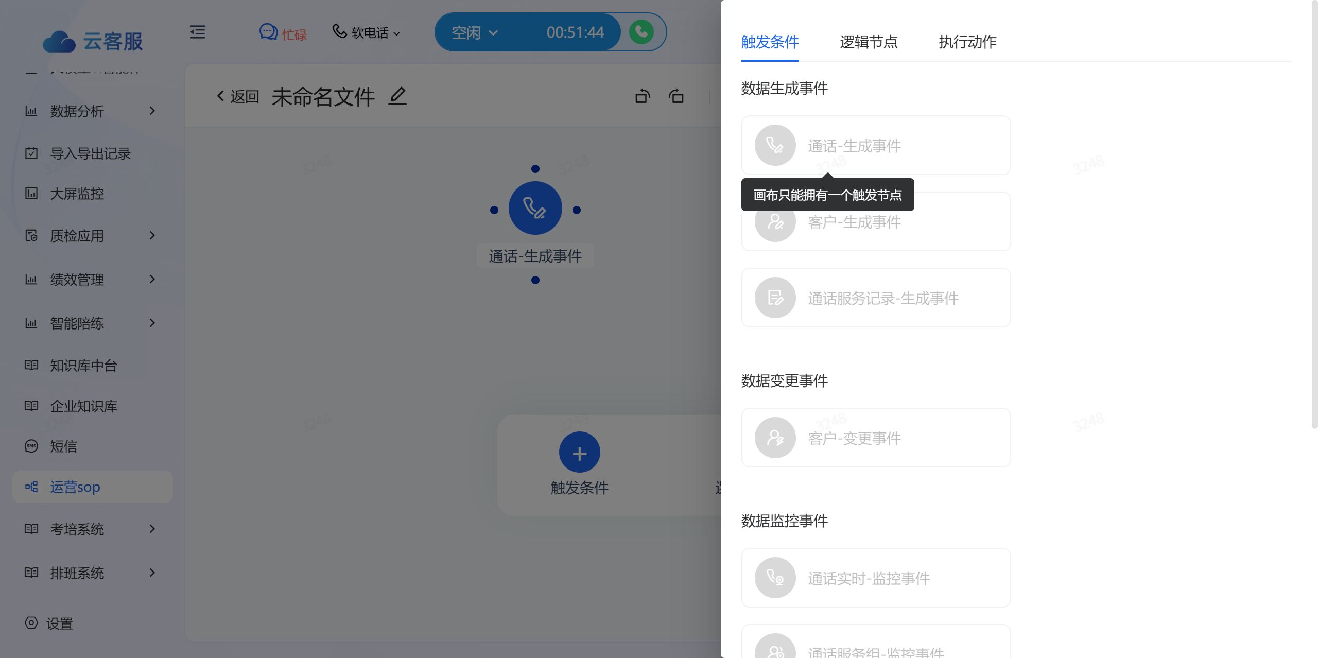 画布只能添加一个触发节点,触发节点包括数据生成事件、数据变更事件、数据监控事件三个大类。