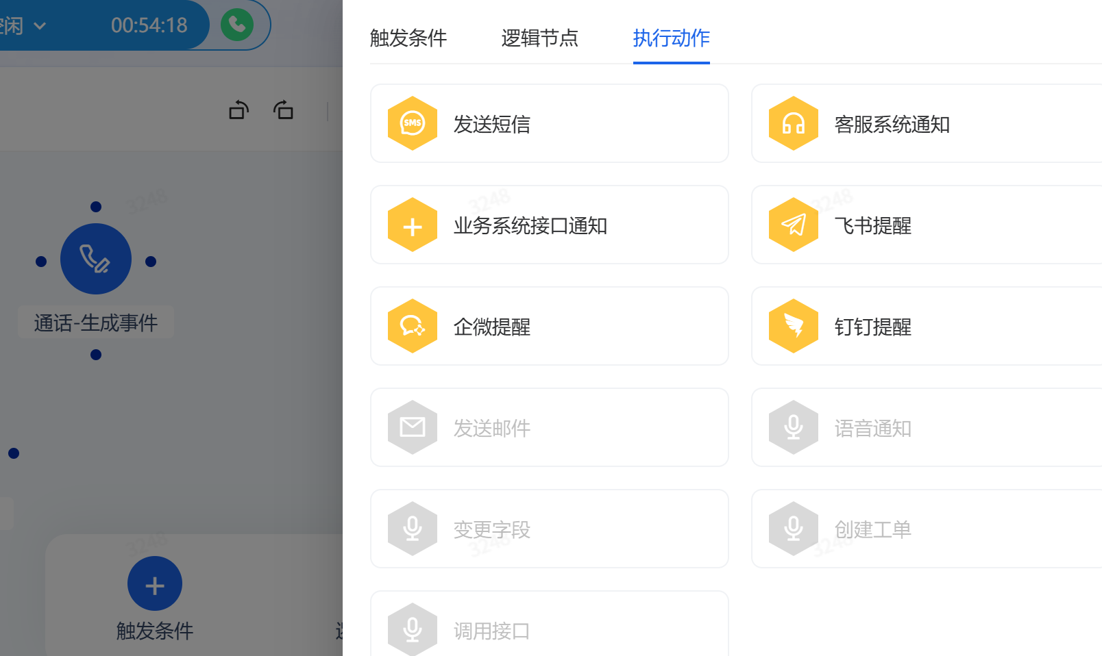 执行动作包括:发送短信、客服系统通知、业务系统接口通知、飞书提醒、企微提醒、钉钉提醒。