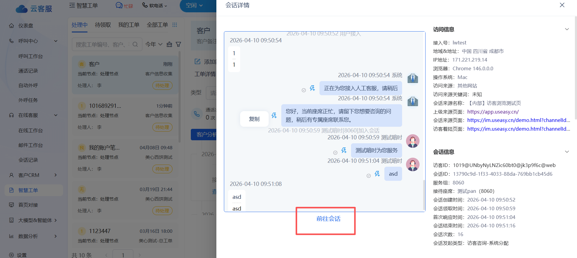 【优化】支持在工单关联会话详情/会话记录详情页面能找到对应会话记录的页面直接重新发起在线对话