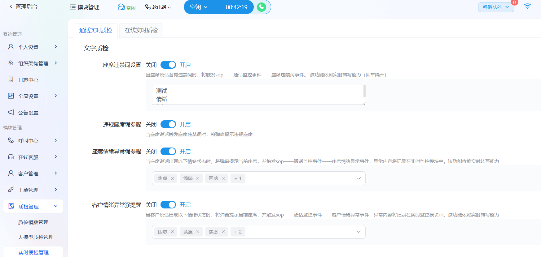 - 实时监测对话双方的情绪状态,对座席的负面情绪(如讽刺、愤怒)或客户的激烈情绪进行预警。