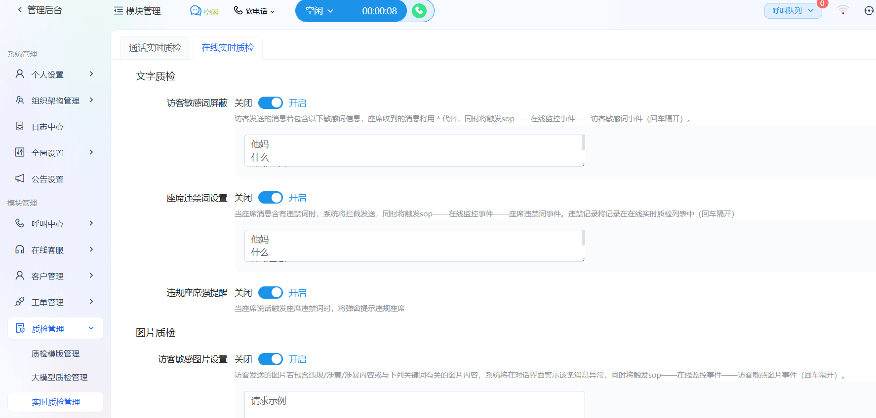 - 管理员告警:同步向管理员或班长的后台发送实时告警通知(如站内信、短信、钉钉/飞书消息),包含跳转实时质检模块按钮,方便其立即切入监听或进行实时指导。