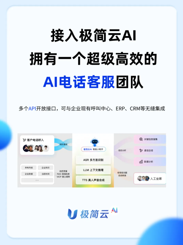 极简云AI语音机器人,以“人机协同”为核心,聚焦夜间/节假日值守、高峰时段辅助接待,与人工坐席互补,凭借专业功能、便捷接入、实在收益,帮助企业破解400电话运营痛点,用低成本实现高价值。