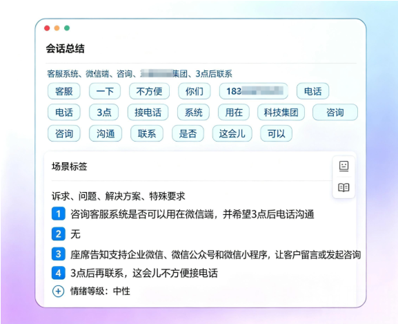 - AI会话总结功能:通话/文本会话结束后,自动生成核心要点总结,标注客户需求、解决方案、待跟进事项,方便后续复盘与跟进,提升团队协作效率。